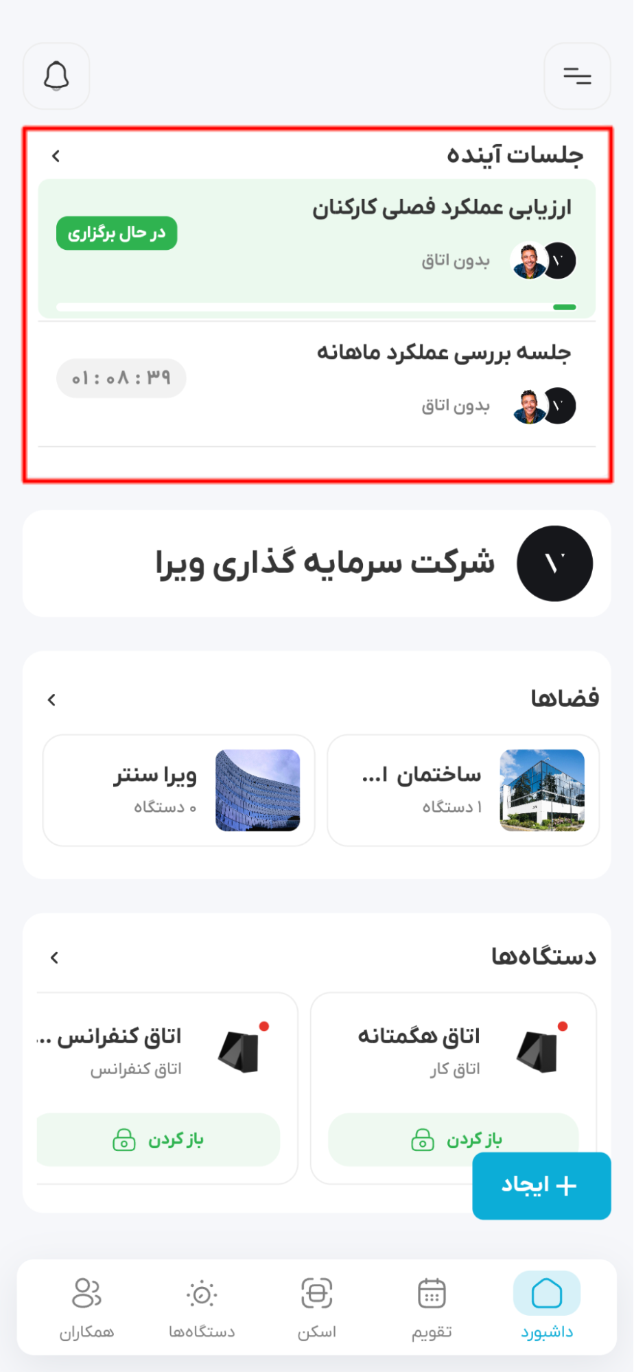 بخش رزرو جلسات این امکان را به شما میدهد تا بهسادگی جلسات کاری خود را برنامهریزی کرده، همکاران خود را در زمانهای مشخص به اتاقهای کنفرانس دعوت کنید و منابع مورد نیاز مانند دستگاهها را رزرو نمایید.