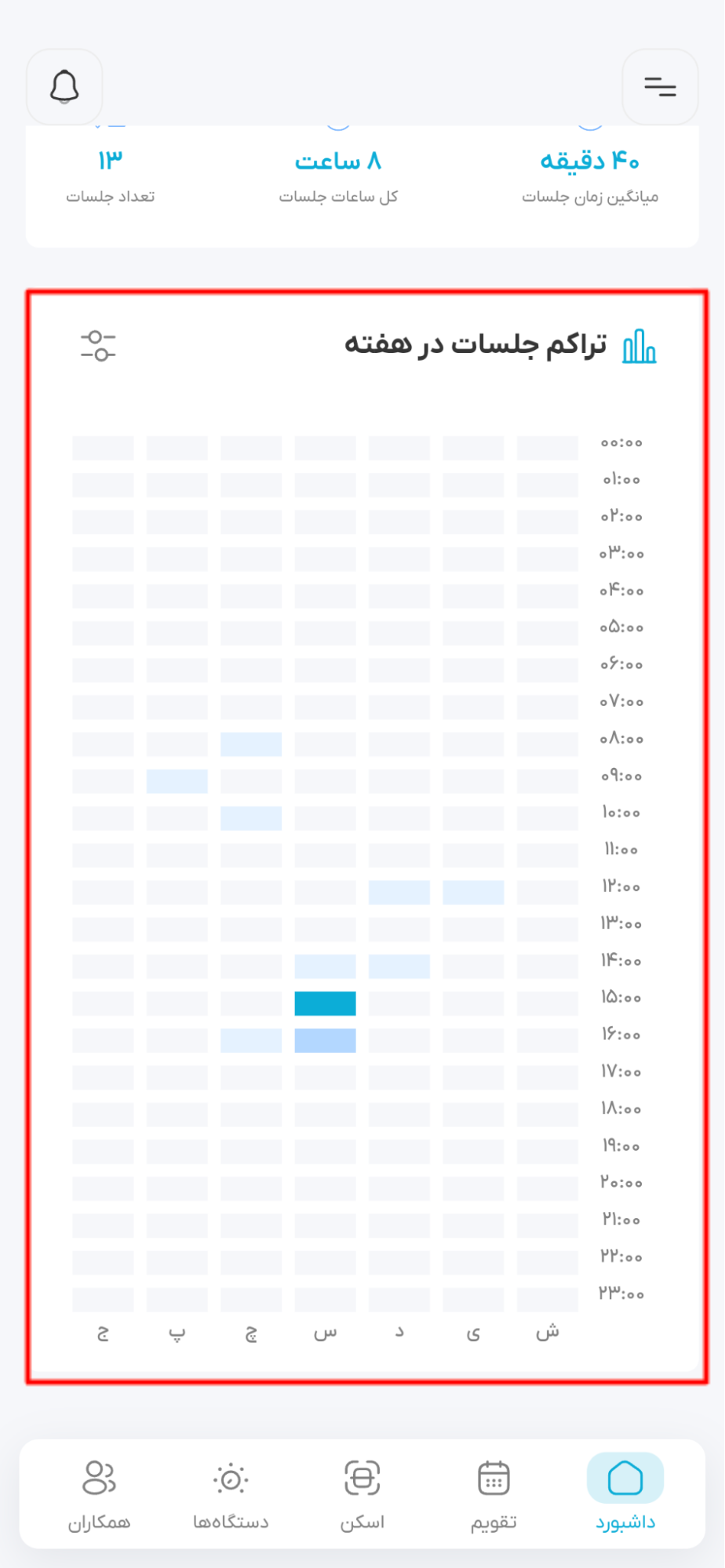 این گزارش به شما یک نمای بصری از توزیع زمانی جلساتتان در طول هفته ارائه میدهد و به شما کمک کند تا الگوهای کاری خود را بهتر بشناسید، ساعات اوج کاری خود را شناسایی کرده و زمانهای خالی را برای برنامهریزیهای آینده به راحتی پیدا کنید.