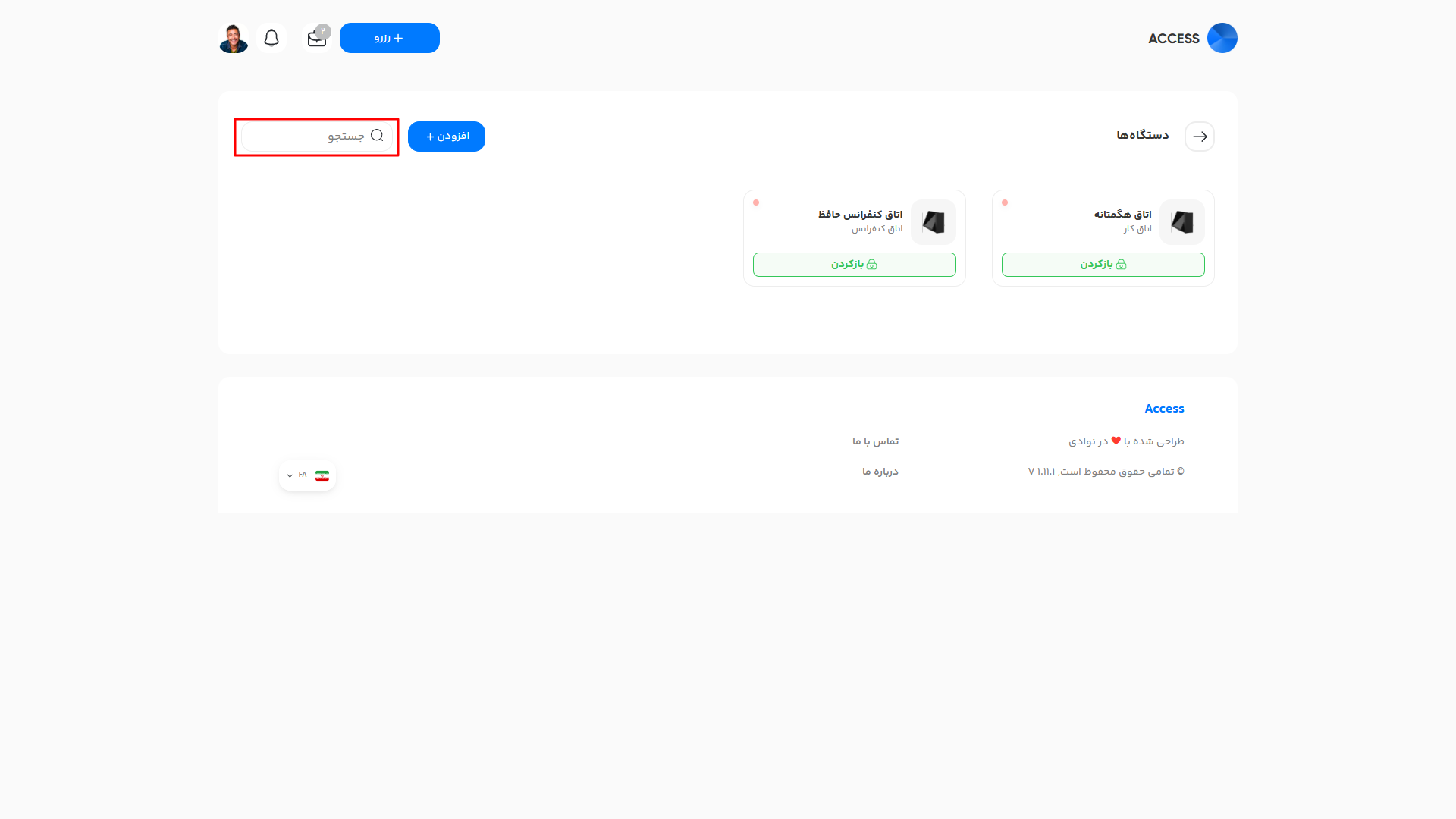 در این بخش میتوانید تمام دستگاههای شرکت خود را مدیریت کنید. با افزودن، ویرایش و مشاهده دستگاهها، کنترل دسترسی، تنظیمات امنیتی و جزئیات هر دستگاه به راحتی در دسترس شما خواهد بود. این امکان به شما کمک میکند تا مدیریت دستگاهها و اتاقها در شرکت ساده و سازمانیافته باشد.